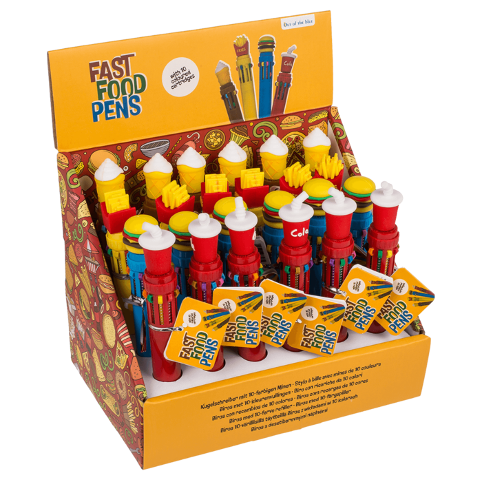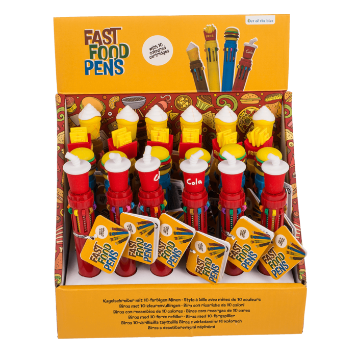 Der Kugelschreiber „Fast Food“ bringt Farbe und Spaß ins Schreiben! Mit 10 farbigen Patronen in einem Stift bietet er maximale Vielseitigkeit – ideal zum Markieren, Schreiben oder kreativen Gestalten. Das auffällige Fast-Food-Design sorgt dabei für gute Laune am Schreibtisch, in der Schule oder im Büro.