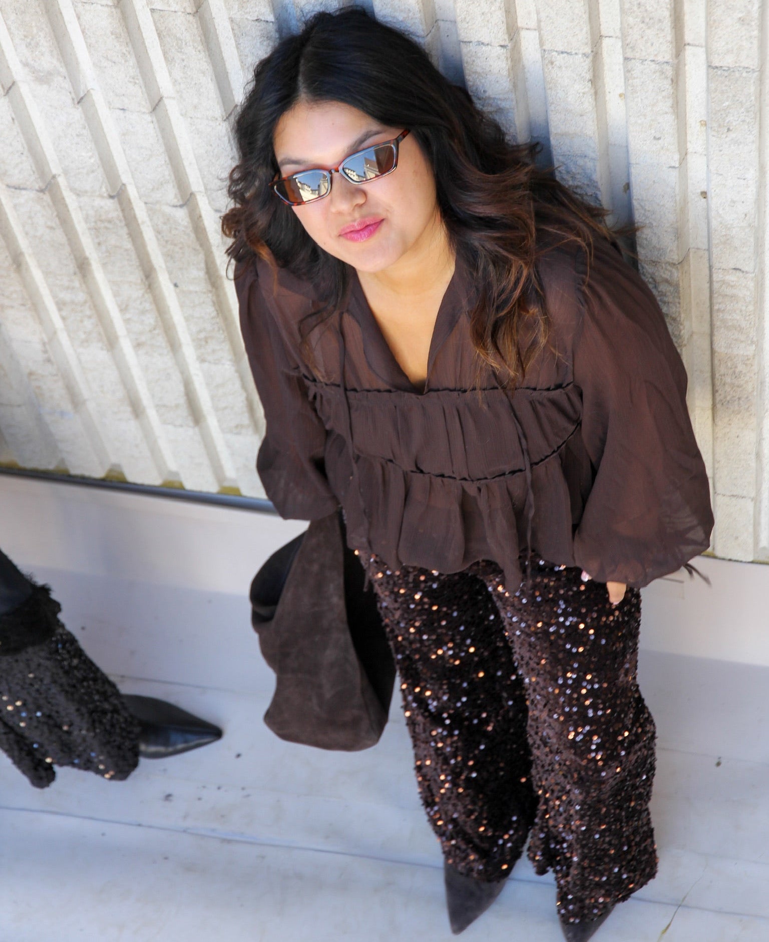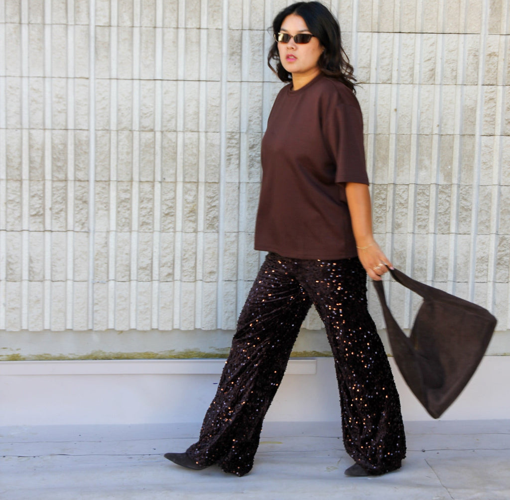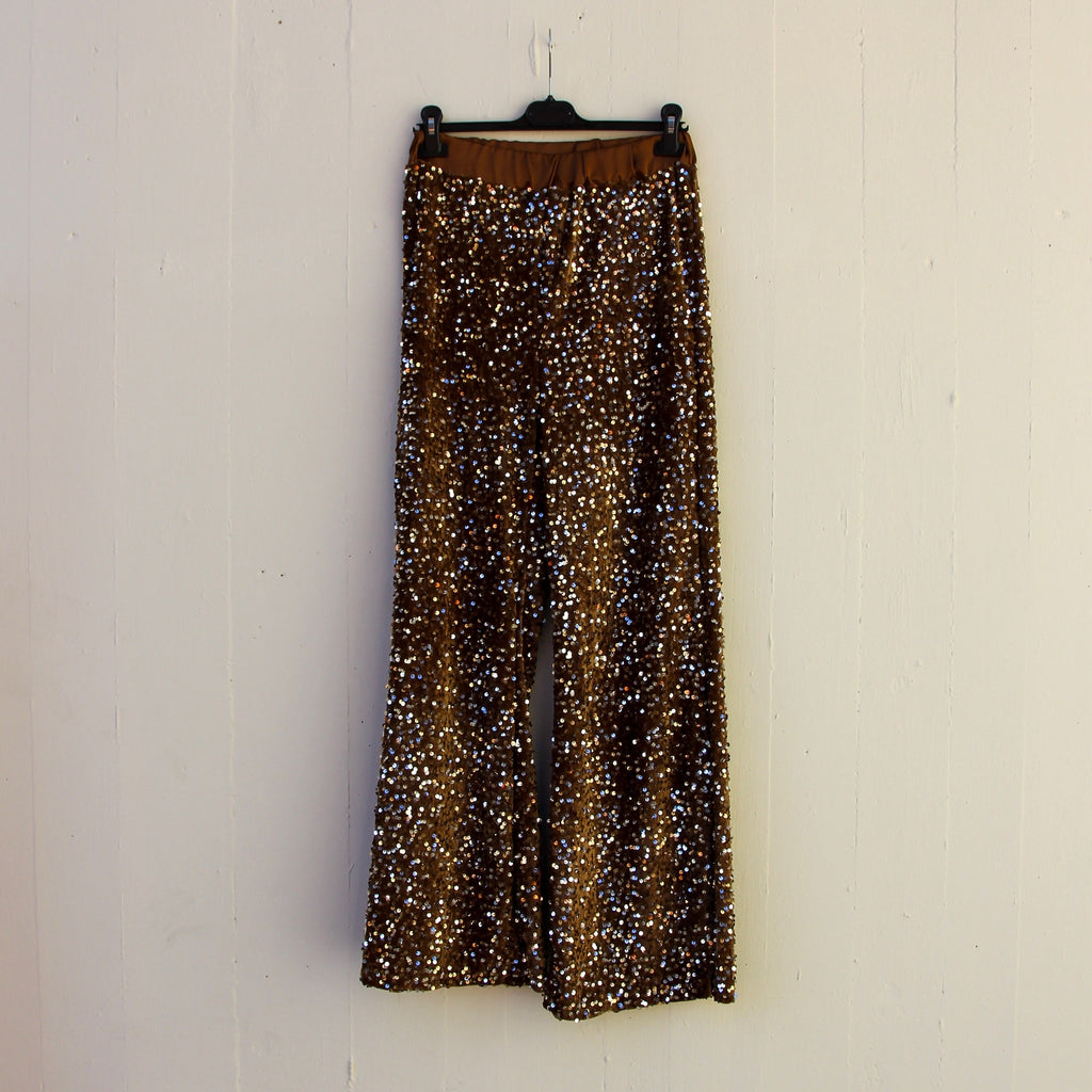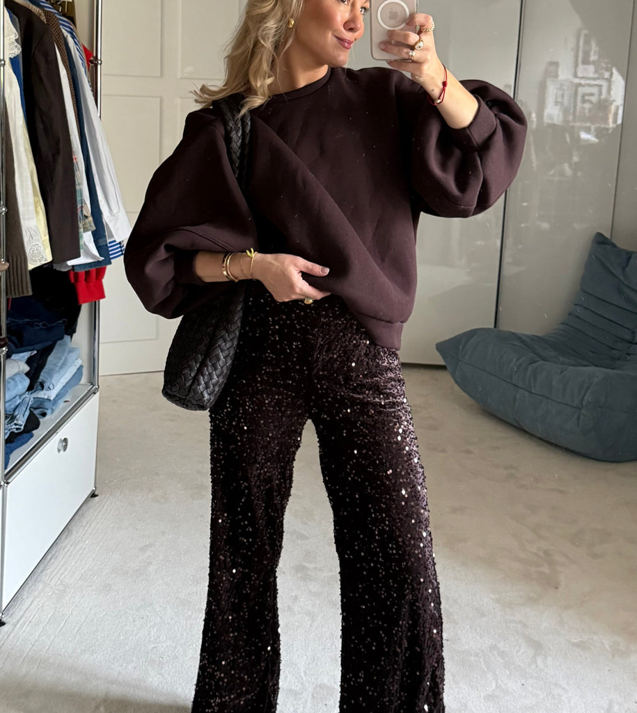 Diese Glitzerhose ist in Kooperation mit Katelinsky entstanden und bringt mit ihrem besonderen Design in Braun und Gold den perfekten Mix aus Glamour und Style.